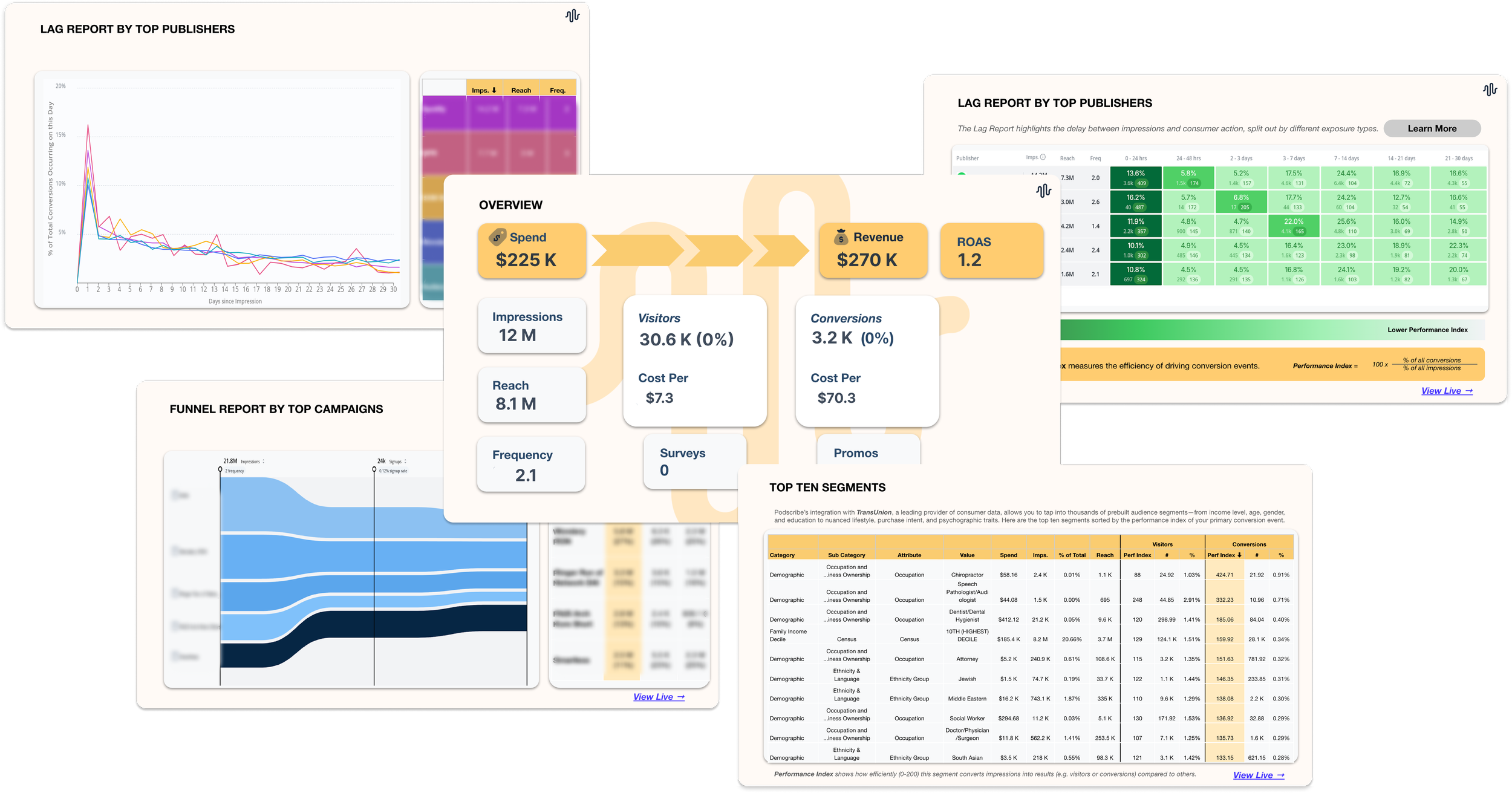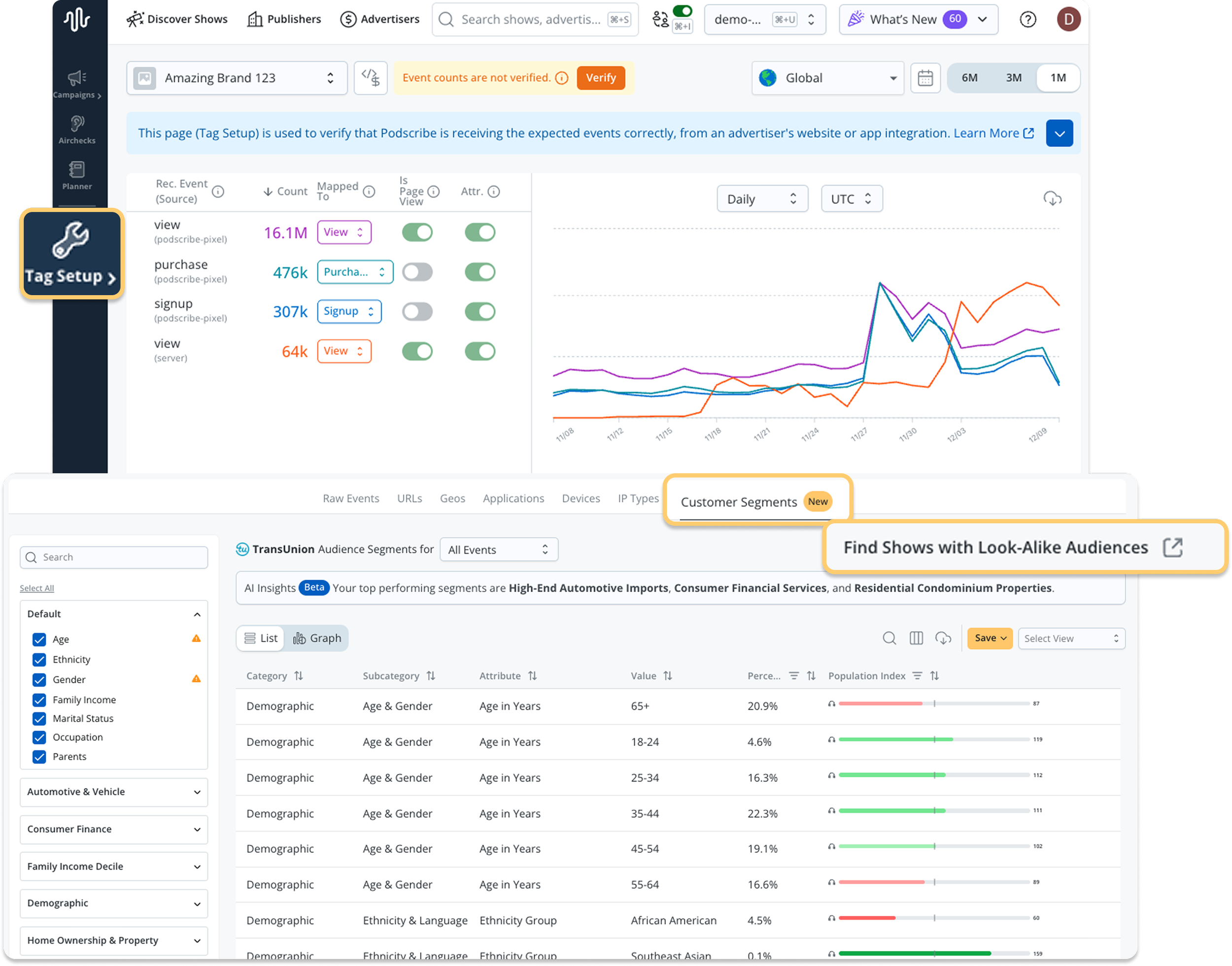 Brought to you by Podscribe’s partnership with TransUnion, brands and publishers can see detailed demographic and behavioral insights about their site visitors and customers directly in Podscribe. This profiling reveals: