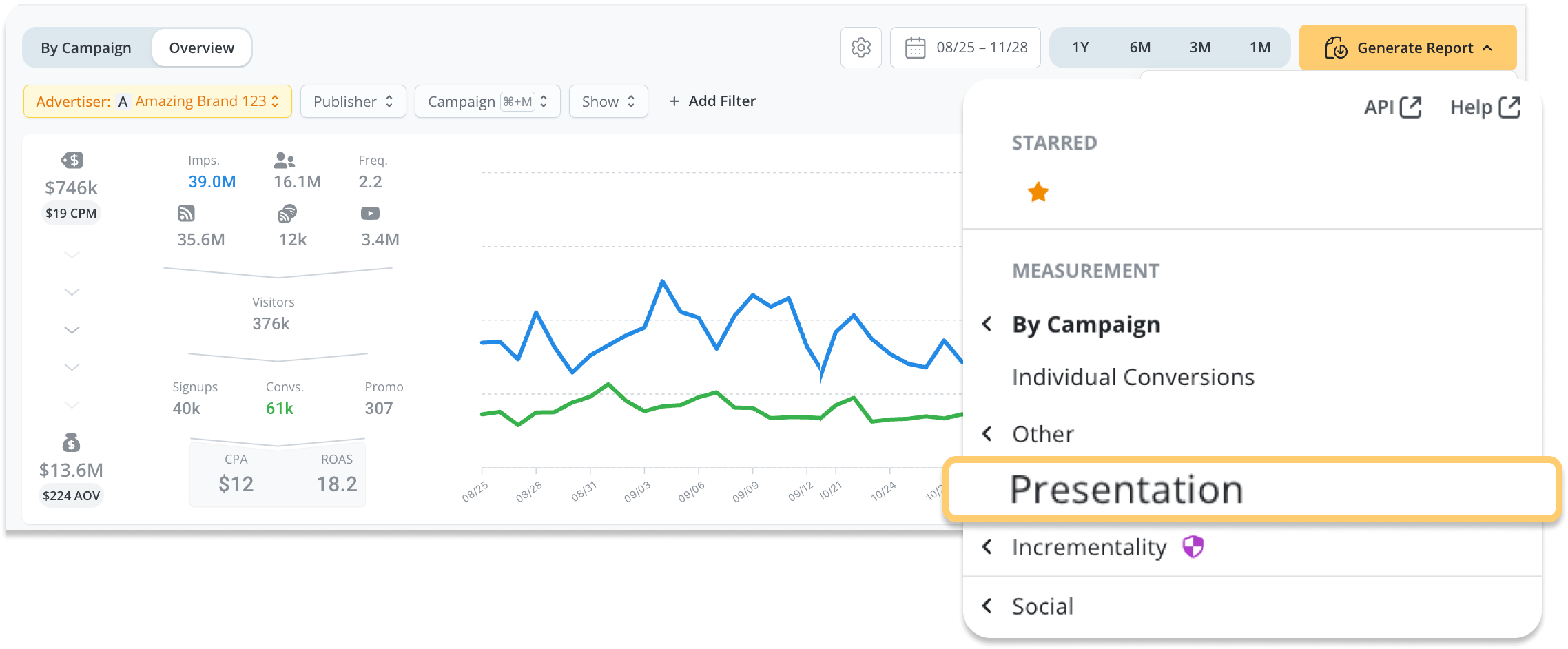 A new export feature that generates a Google Slides presentation summarizing media performance directly from your Overview tab, based on your selected timeframe. The deck includes key topline metrics, insights across tabs such as Audience Segments, Geo, Lag Report etc. (along with links), and incrementality results, plus charts auto-filled from your data.