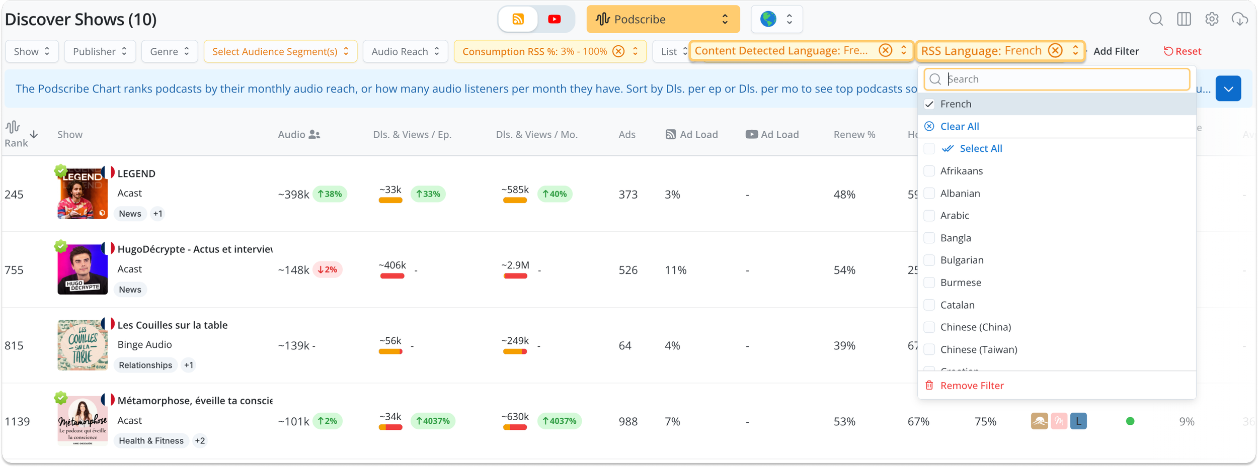 Podscribe now displays each show’s primary language right on show pages and across all rankers! Plus, you can filter by language to quickly zero in on the audiences you care about most.