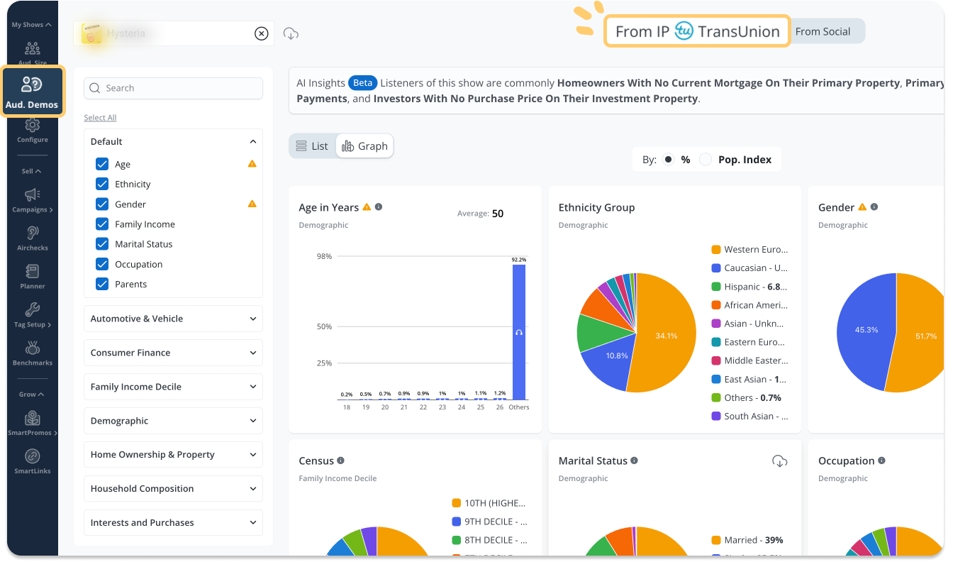 Publishers can now view TransUnion demographic data in the Audience Demos > From IP Transunion tab. This update makes it simpler to get audience insights for their shows and bulk export them with one click.