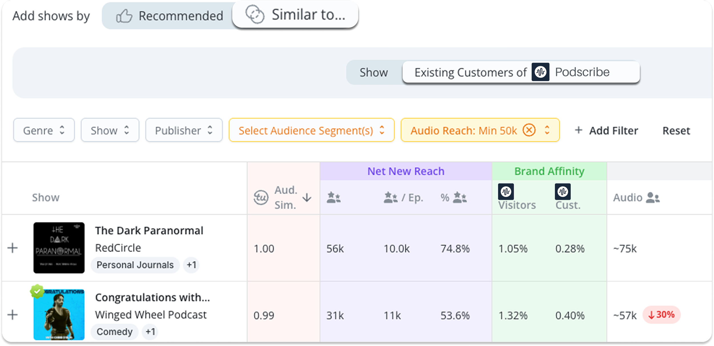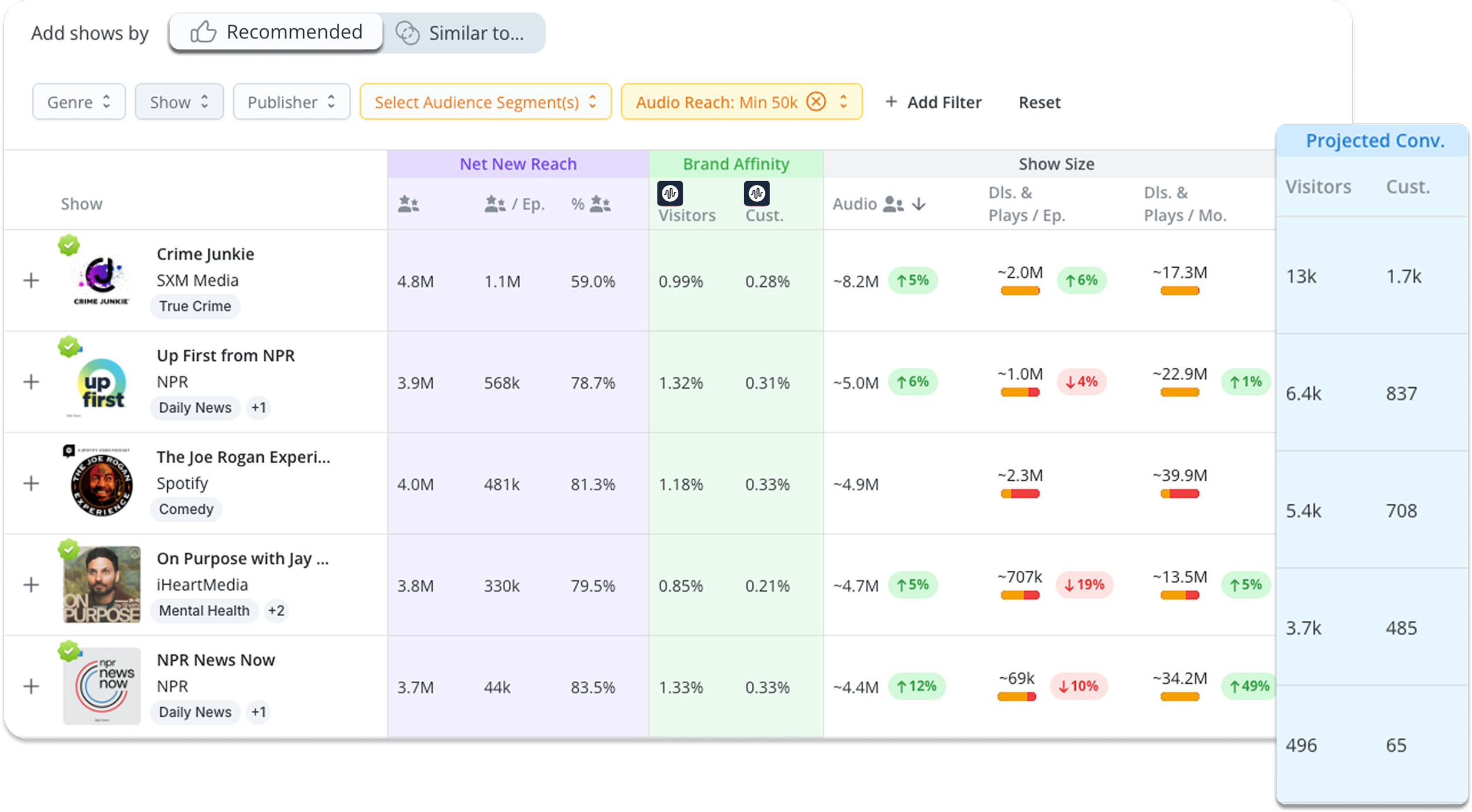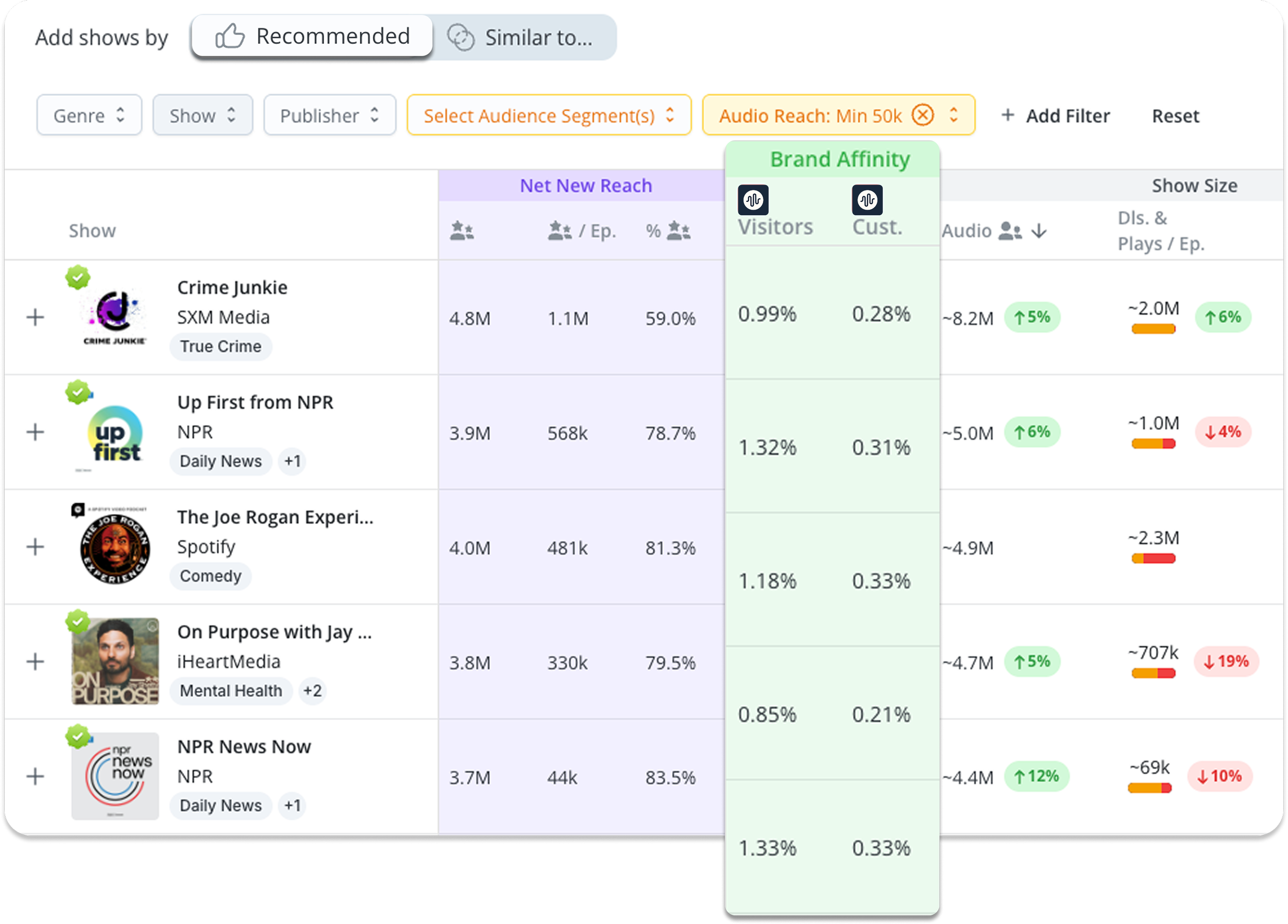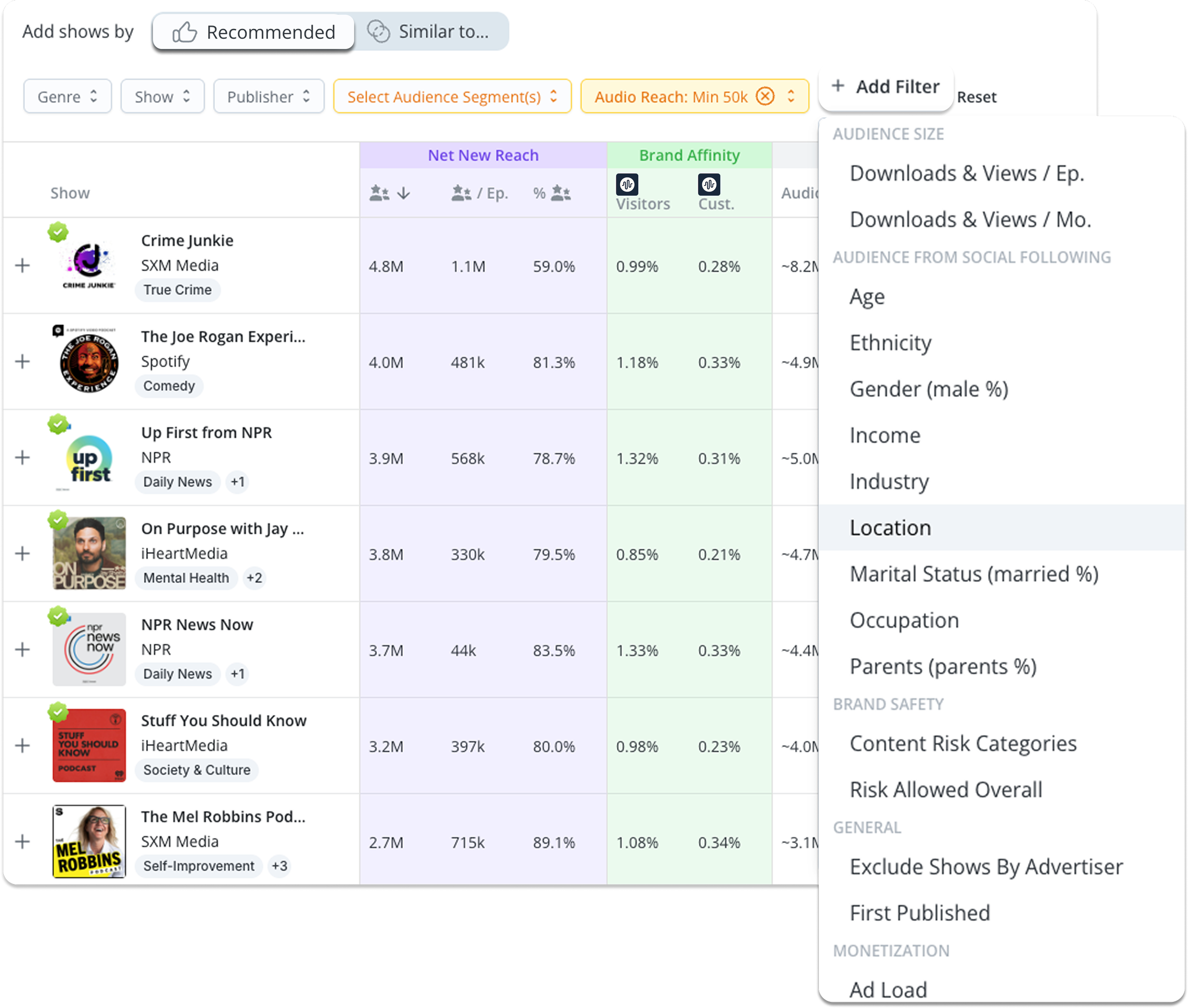 Smarter targeting: Discover shows with high net new reach to expand audience exposure, with filters by genre, publisher, or specific shows.