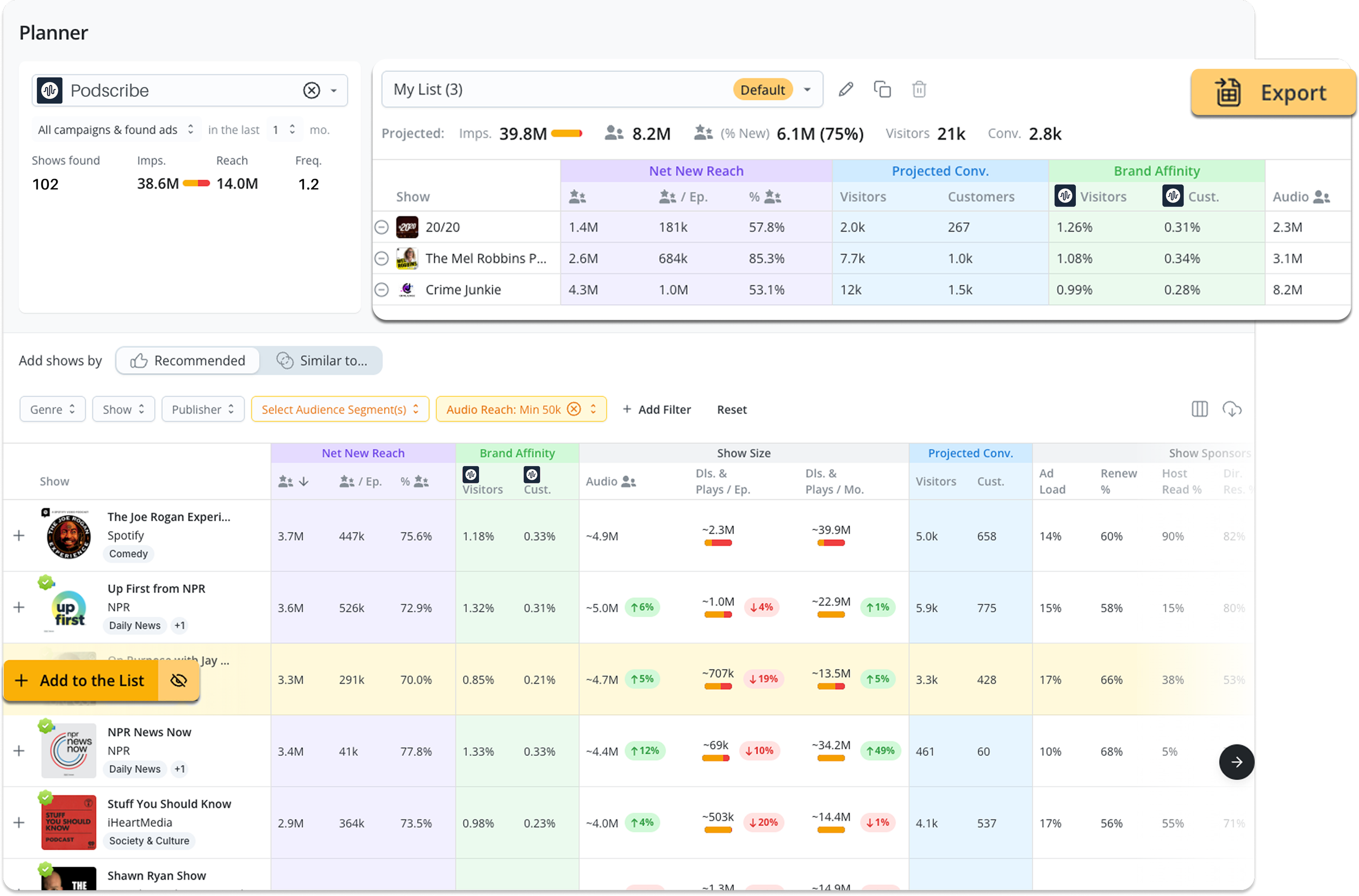 Just like before, continue to find podcasts with the most net new reach. Now, also see powerful new data-points such as Brand Affinity and TransUnion segment matching, while organizing your shows into separate lists.