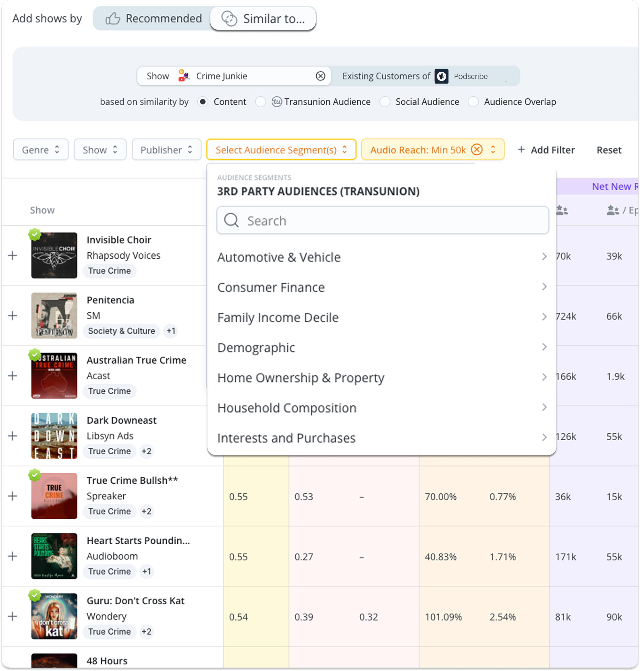 Audience-matched discovery: Explore similar shows based on content, TransUnion segment profiles, social audience, or listener overlap.