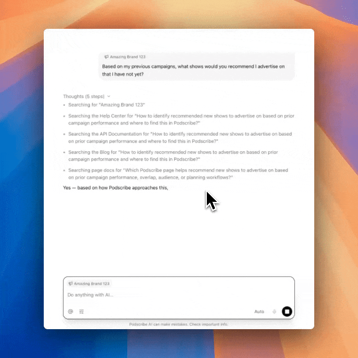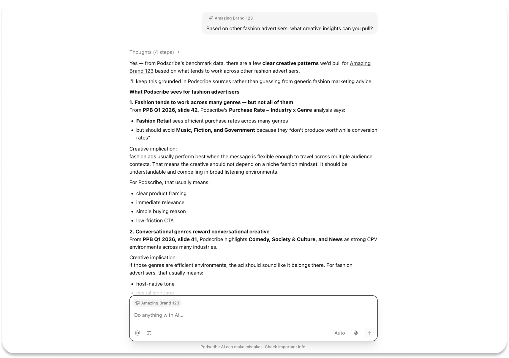 Most platforms just give you data, and leave you to derive the insights. Podscribe AI is built to give you answers.