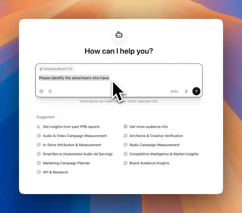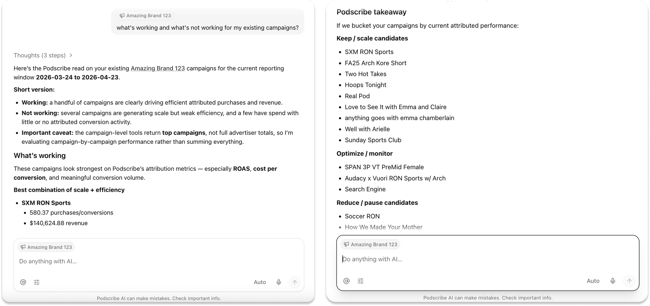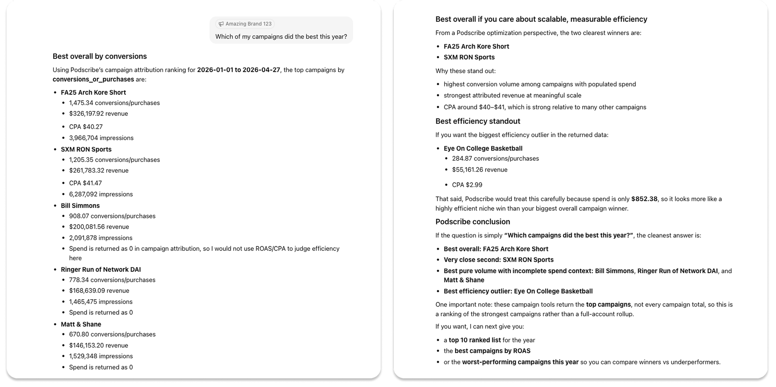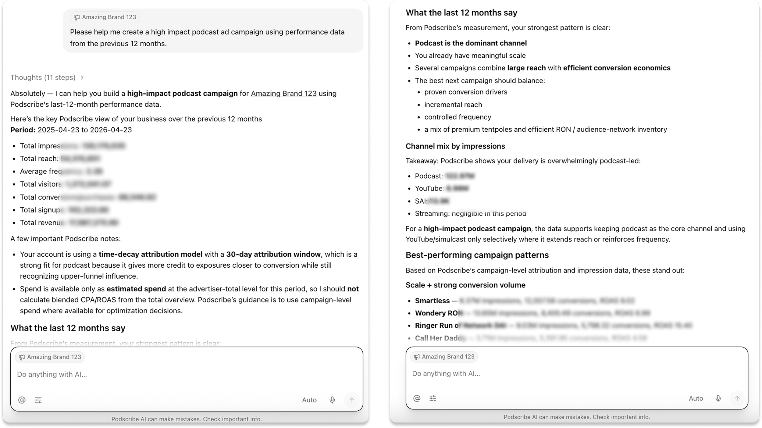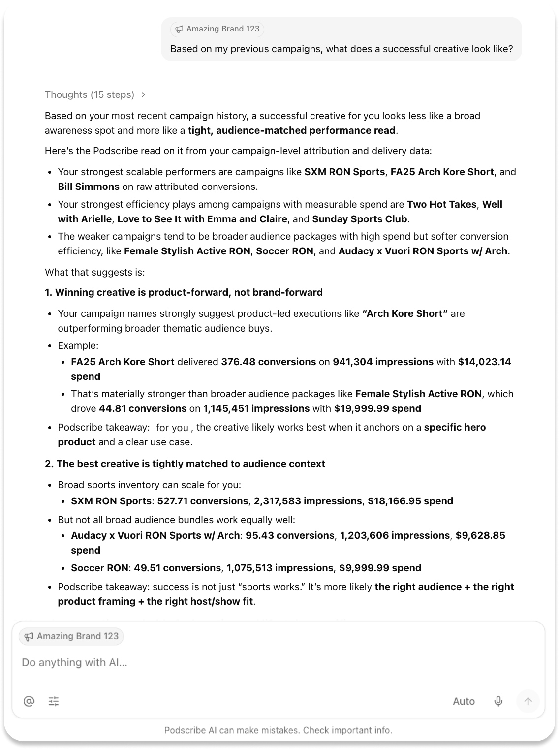 Sample Query: “Please help me create a high impact podcast ad campaign using performance data from the previous 12 months.”